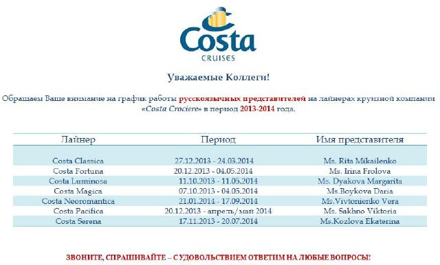 Графік роботи російськомовних представників на лайнерах круїзної компанії "Costa Cruises"