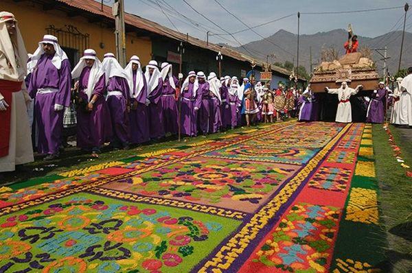 Нигде в мире вы не увидите такого празднования Пасхи, как в Антигуа-Гватеамала. Начало праздника приходится на первый день Великого поста. На протяжении недели по городским улицам, усыпанным цветным песком и лепестками цветов, проходят религиозные парады и шествия. В воздухе витает аромат ладана, а почти каждое здание задрапировано крепом черного цвета. На празднике можно увидеть представления о суде и казни Спасителя, поражающие воображение своей реалистичностью.